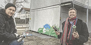 Container als Kunstobjekt – das ermöglicht der Unternehmer Richard Freiherr von Rheinbaben an den Behelfsbauten, die er für seine Firmen an der Gautinger Straße hat errichten lassen. Der „Wandmalkünstler“ Martin Blumöhr hat schon begonnen.